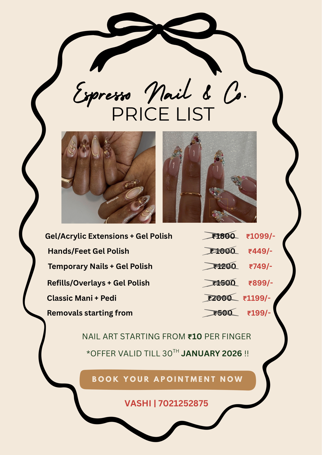 Espresso Nail & Co. is a luxury nail studio in Sector 28, Vashi (Navi Mumbai) offering premium gel nails, nail extensions, natural nail overlays, manicures, pedicures, and custom nail art. We specialise in minimal, clean, long-lasting nail designs using high-quality products and strict hygiene standards. Whether you want everyday nude nails, soft glam gel extensions, or bold creative designs, we create nails that look elegant and last. Our studio is designed to feel warm, calm and premium, with personalised service for every client. We serve clients from Vashi, Koper Khairane, Juinagar, Nerul, Ghansoli, and across Navi Mumbai. Book your appointment for the most aesthetic nails in Vashi.